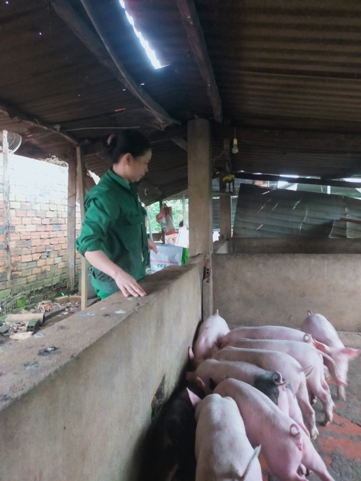 Với bản tính cần cù chịu khó, chị làm vườn thuê, thu gom ve chai bán; ngoài ra chị còn chăn nuôi heo thịt. Ban đầu, do vốn ít nên chị chỉ chỉ nuôi 1 con heo nái, sau đó được Hội hỗ trợ tiền vốn. Dần dần, áp dụng các kiến thức về chăn nuôi từ sách, báo, qua các lớp tập huấn và kinh nghiệm từ các chị em trong chi hội, đàn heo của gia đình chị hạn chế mắc các loại dịch bệnh, phát triển tốt. Từ 1 cặp heo giống đẻ mỗi lứa 11 con hiện nay chị có 30 con heo thịt, số lượng đàn heo ngày một tăng lên giúp gia đình chị có nguồn thu ổn định từ việc bán heo. Đến nay kinh tế của chị cũng đã tương đối ổn định.